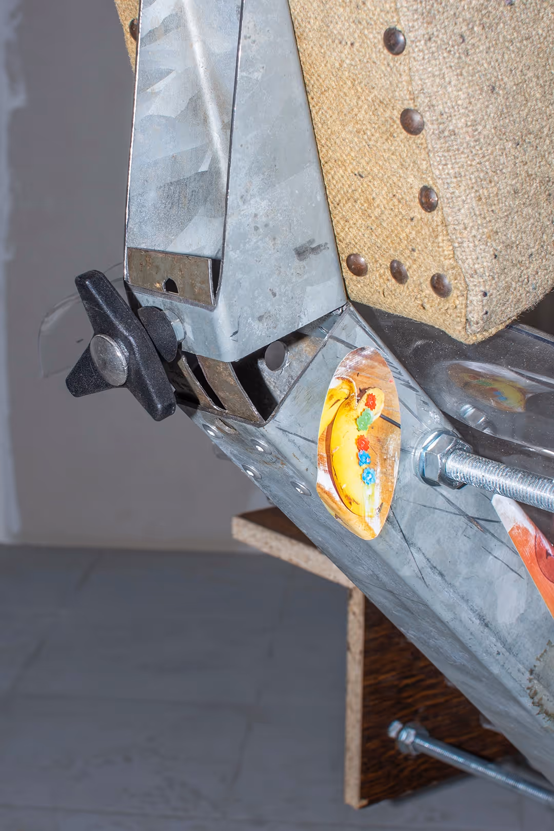 A series of stickers were added on the steel skeleton. Inspired by the one you see on the street, these elements are for me way to ornament the city, a really detailed one, made to give a more or less simple information or symbolic meaning. Here, are represented photography i did while i was partying. The selection was made through the constraint that i had completely forgot that i've took these picture. On top of that Cedric Elisabeth made a soundscape that's plays on the headphone. He combined different recording i did while i was doing that seat. Mixing sound of tools and materials, street recording and music that was playing in the studio, he created a sound that remind me a good old house esta. A strange confrontation between rest and desire to party is emerging. Two context or body situation which seems opposite in energy but for me which favor self revelation and the urge to share it.