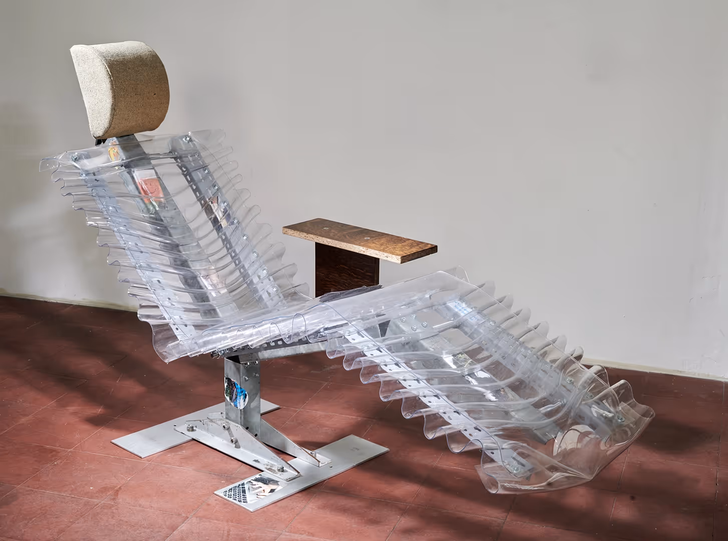 This reinterpretation of the symbolic psychiatric long seat is actually more a tool to confession than a confession in itself. The transparency, the status, and the aesthetic between comfort and incomfort of this object is for me an ode to revelation, self learning and relaxation. I wanted to create the surprise of comfort by using an unconventional material like this soft transparent pvc sheet normally used to protect tablecloth. Through this transparency, i was able to reveal and play with the mechanical structure that is holding the body.