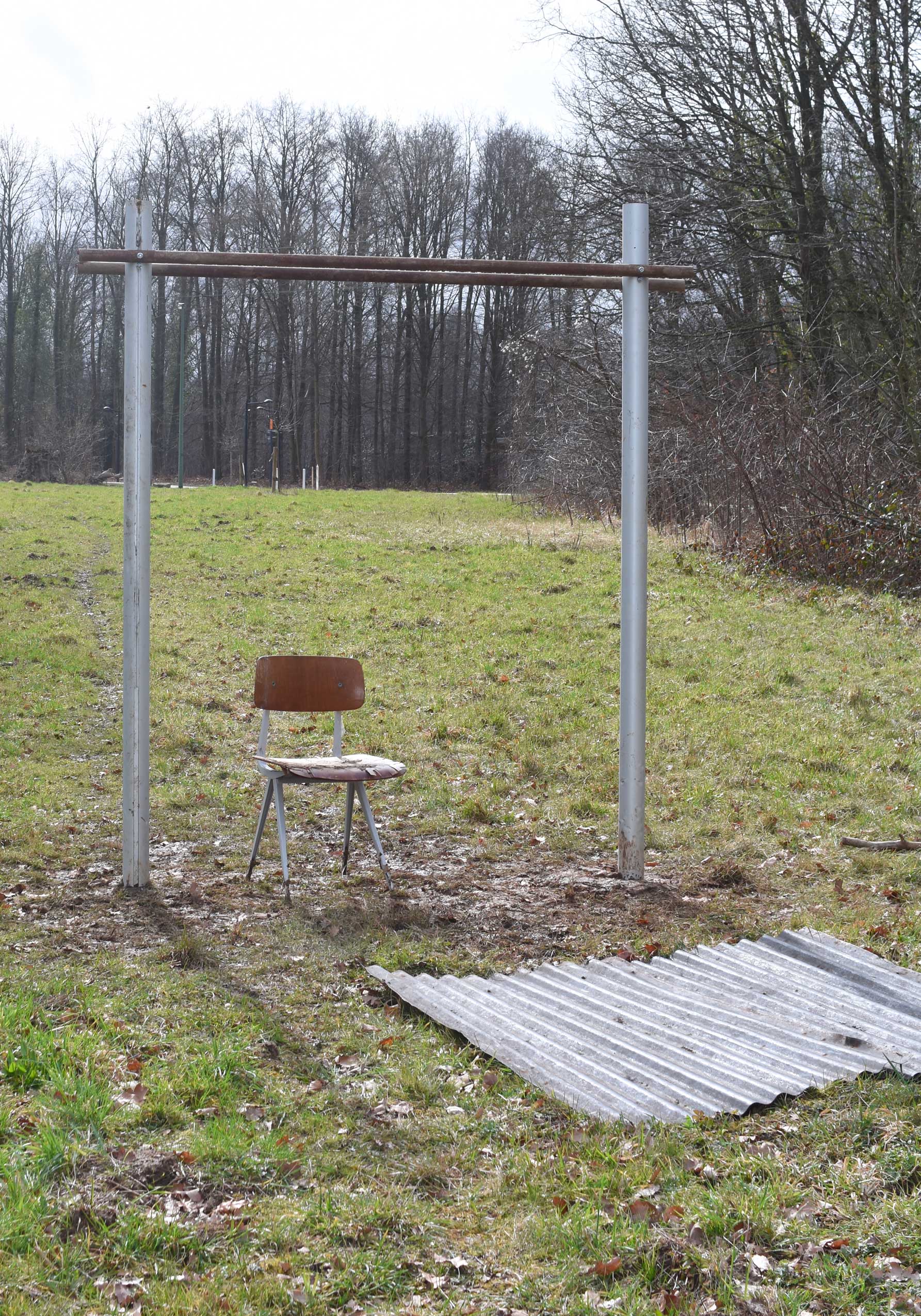 During the month preceding the exhibition, the artist cycled around the Sart Tilman area in order to locate, collect and gradually assemble elements found on the site to make installations. Arnaud Eubelen’s desire to “make with” the materials found on the site corresponds not only to his artistic practice of many years, using almost essentially waste materials, but also to a desire to create works in direct relation to the site and its history. Thus, for this project at the Sart Tilman, Arnaud Eubelen pushes the process further by forbidding himself to use materials from outside the site. This constraint also led the artist to consider materials that are generally absent from his plastic vocabulary, such as those directly from nature, thus adding a new dimension to his work.